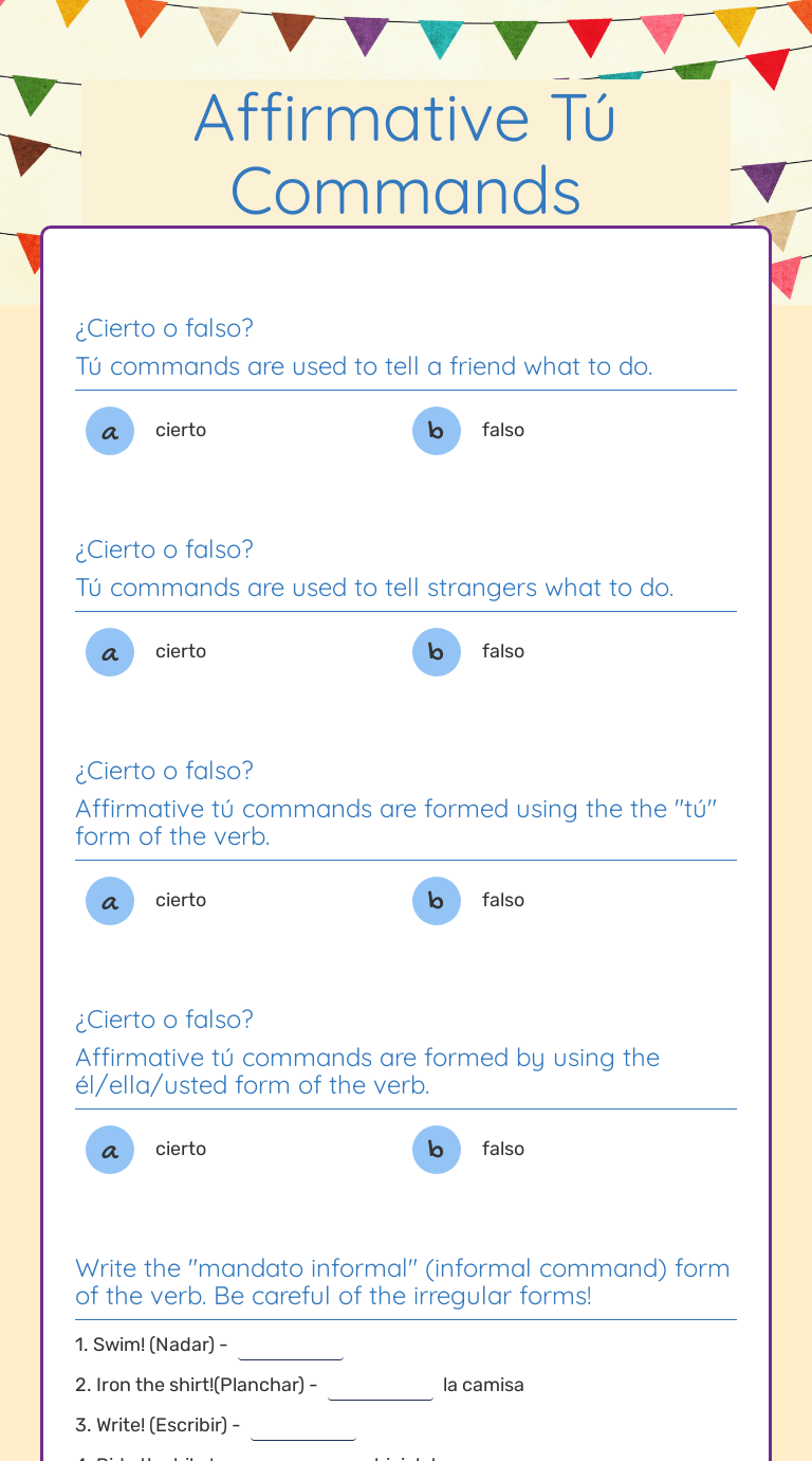 Spanish Affirmative Tu Commands Teaching Resources from az779572.vo.msecnd.net There is also a special set of commands for the vosotros/vosotras form of tú. You can find more about adding accents when using direct object pronouns here! We often need to order, suggest, or instruct others to say or tell something in particular. Log in to save your progress. Get started on your way to speaking spanish conversationally! Learn about formal affirmative and negative commands with fun practice quizzes. The following examples of commands use three regular verbs: To create an usted command, remember the mantra: